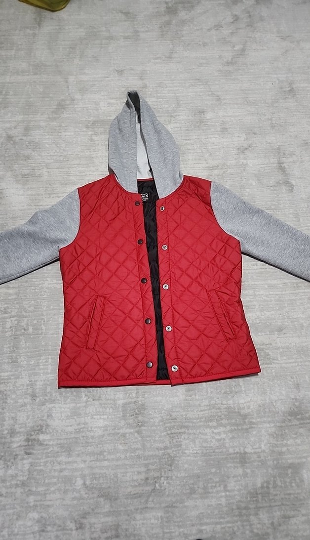 Düğmeli kapüşonlu ve uzun kollu, kırmızı kapitone ön ve gri yumuşak kollara sahip dar kesim kadın ceketi, sokak ve rahat athleisure tarzına uygun.