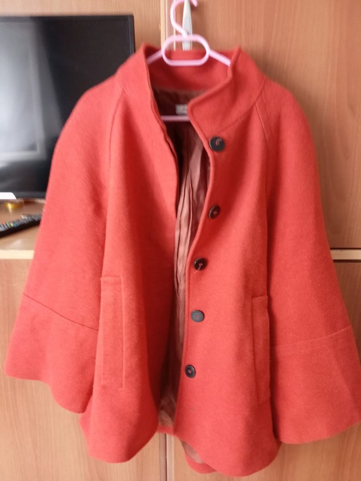 Düğmeli, kırmızı hamile midi kaban, notched yakalı ve uzun kolludur. Yumuşak ve sıcak kumaştan, rahat ve trend bir görünüm sağlar.