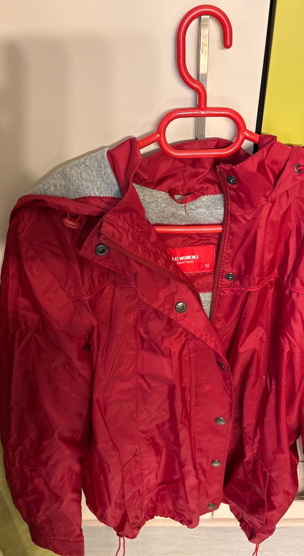 Düğmeli, uzun kollu, yuvarlak yaka kırmızı hamile mont. Midi boy, bol kesim ve sentetik kumaştan, minimalist sokak tarzı için uygun.