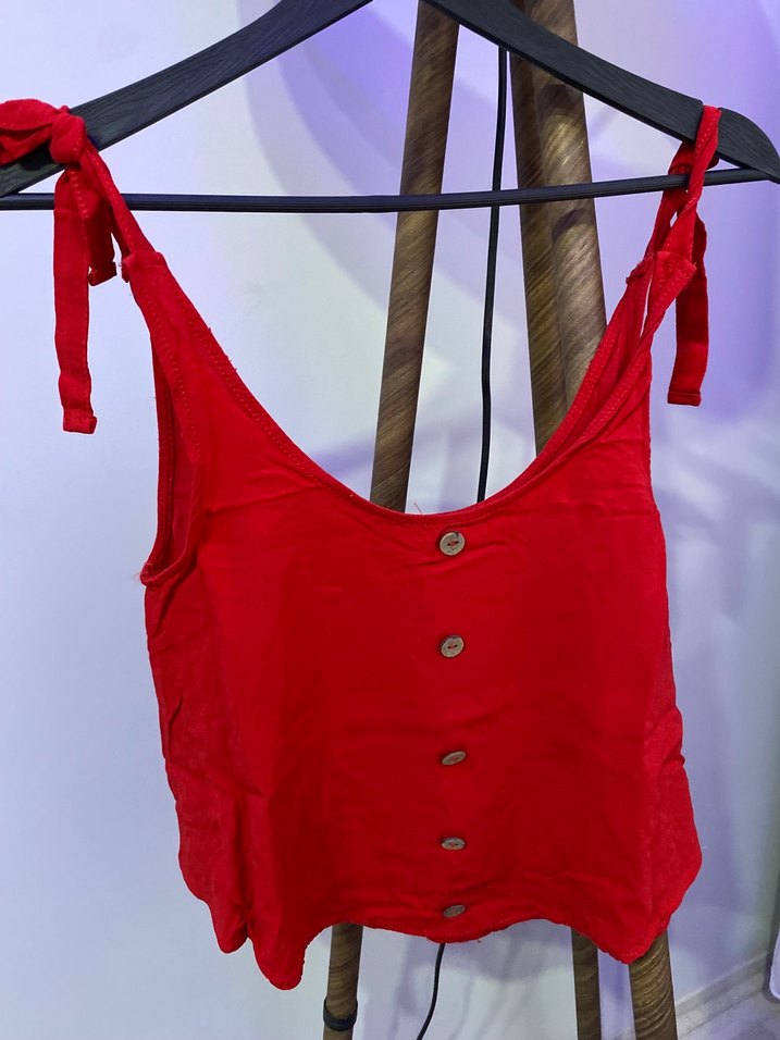 Kırmızı, düğmeli önü ve V yakası olan, ince askılı, kısa boy, bol kesim keten kadın atlet. Tie-dye desenli, günlük sokak tarzı için uygun.