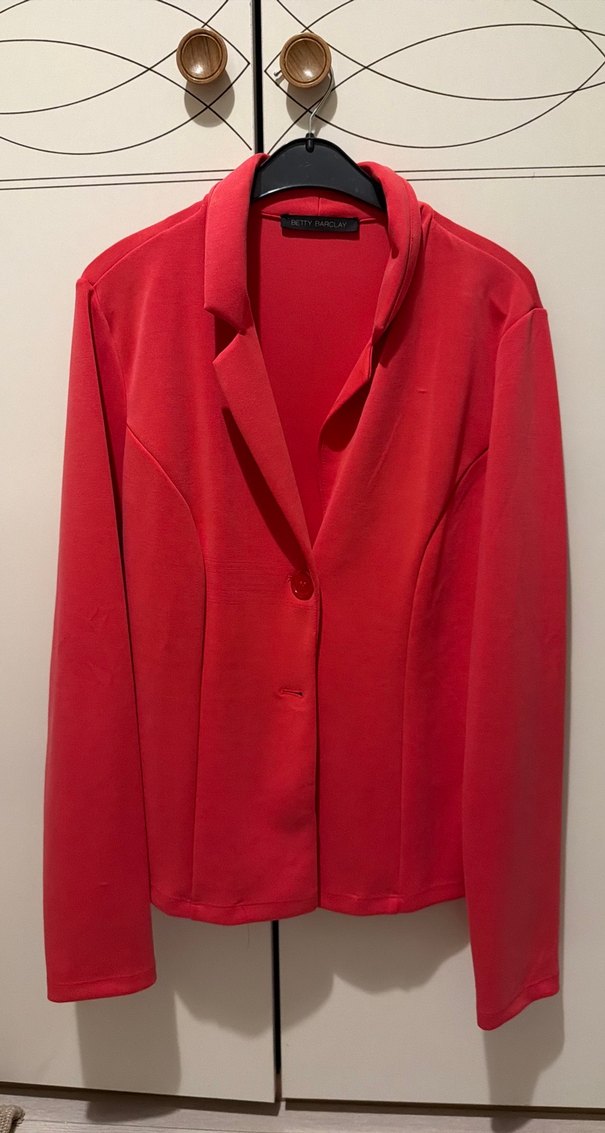 Düğmeli önü ve kırmızı rengiyle, normal uzunlukta ve uzun kollu kadın blazer. Düz ve iş ortamına uygun, yumuşak ve sıcak kumaştan yapılmıştır. ✨