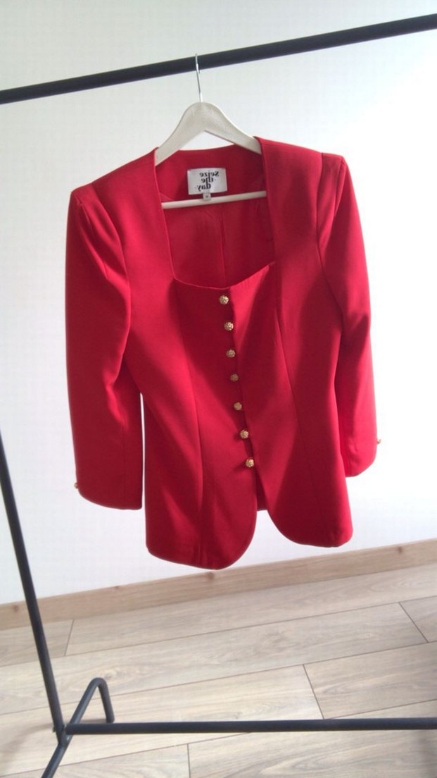 Gold Düğmeli kollarında da düğme detaylı, kırmızı renkte, uzun kollu kadın blazer. İpek gibi dokusu ve normal uzunluğu ile modern klasik tarzda, şık bir parça.