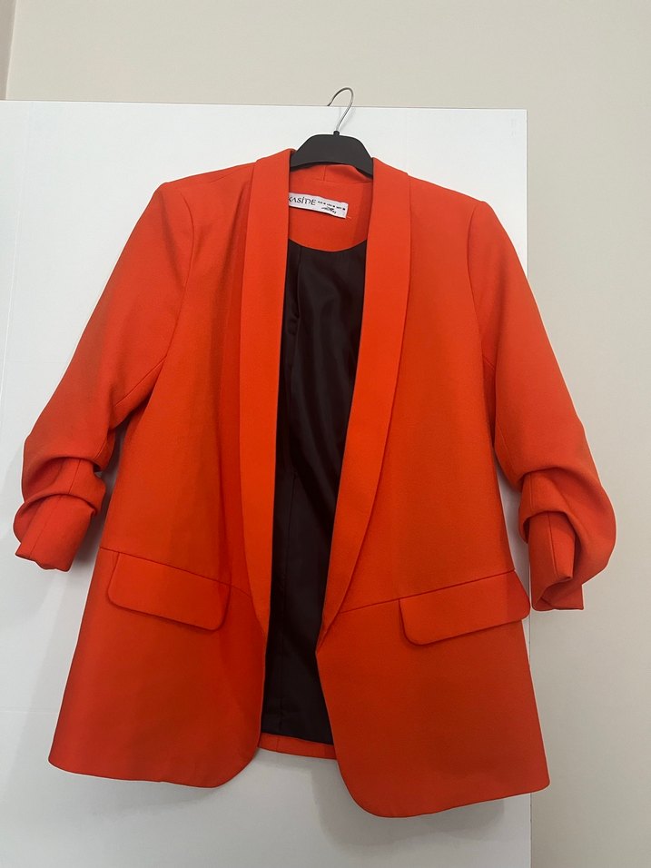 Kırmızı kadın blazer ceket, düğmeli ve uzun kolludur. Normal kesim ve parlak sentetik kumaştan üretilmiştir, ofis için uygundur.