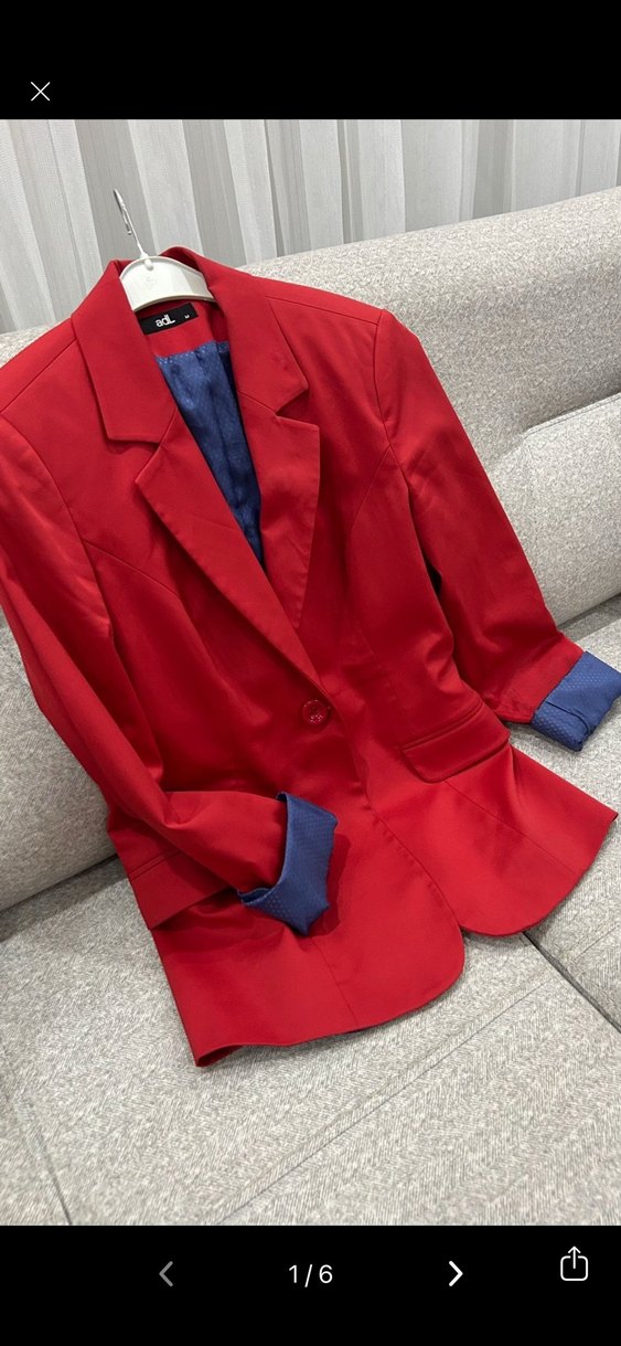 Düğmeli kırmızı kadın blazer ceket, kesik yaka ve uzun kollu. Mavi iç manşet detaylı, normal kalıp ve midi boyda, ofis ve günlük kullanıma uygun. Hem spor hem şık kotlarla çok güzel uyumlu kombin yapabilirsiniz