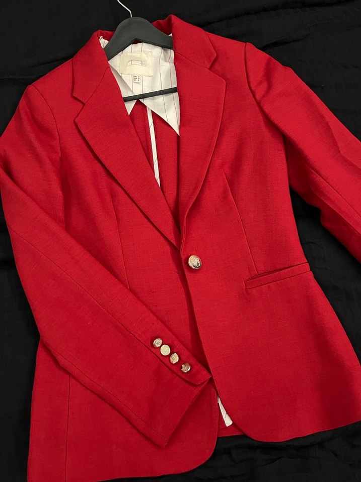 Düğmeli, kırmızı kadın blazer ceket, kesik yaka ve uzun kolludur. Normal kesim, parlak kumaştan olup ofis şıklığı sunar.