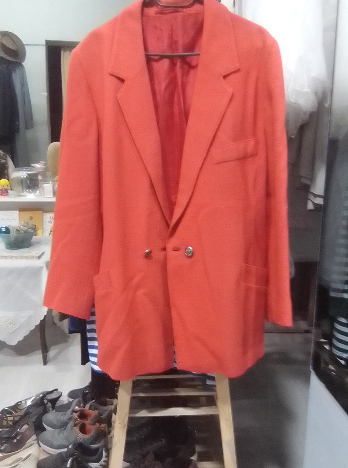 Düğmeli, kırmızı kadın blazer ceket, yakası kesik, uzun kollu ve normal boyda. Ofis için uygun, ipeksi dokulu ve rahat kesim.