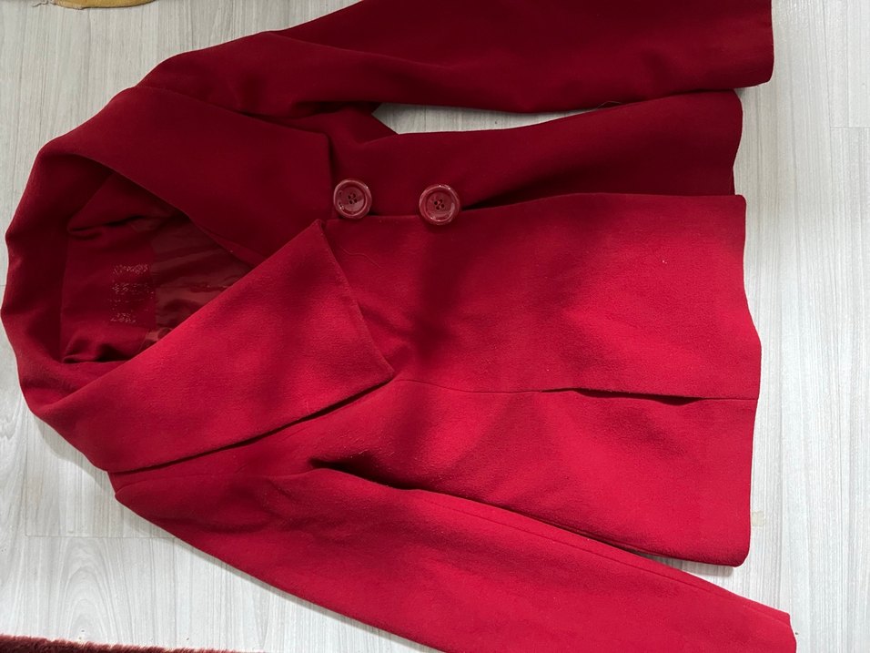 Düğmeli, kırmızı, uzun kollu kadın blazer ceket. Yumuşak ve sıcak dokulu, normal ve midi boyda, kaşe kalın
