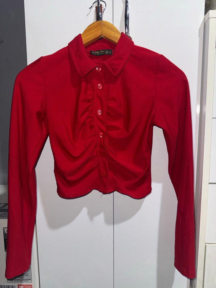 Düğmeli, yakalı ve uzun kollu kırmızı kadın bluz, parlak sentetik kumaştan ve midi boydadır. Ofis için uygundur. S-M