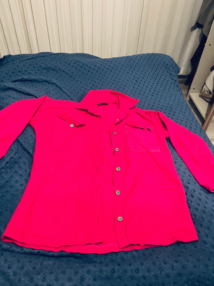 Bu koyu kırmızı kadın gömlek, uzun kollu, yaka detaylı ve bol kesimdir. Düğmeli ön kısmı ve iki göğüs cebi vardır, yumuşak ve sıcak kumaştan üretilmiştir.
