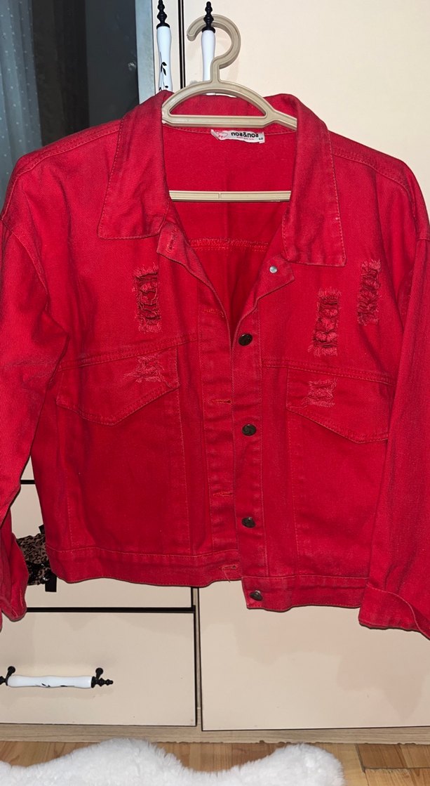 Düğmeli Kırmızı Kadın Denim Ceket 38.40 beden olur