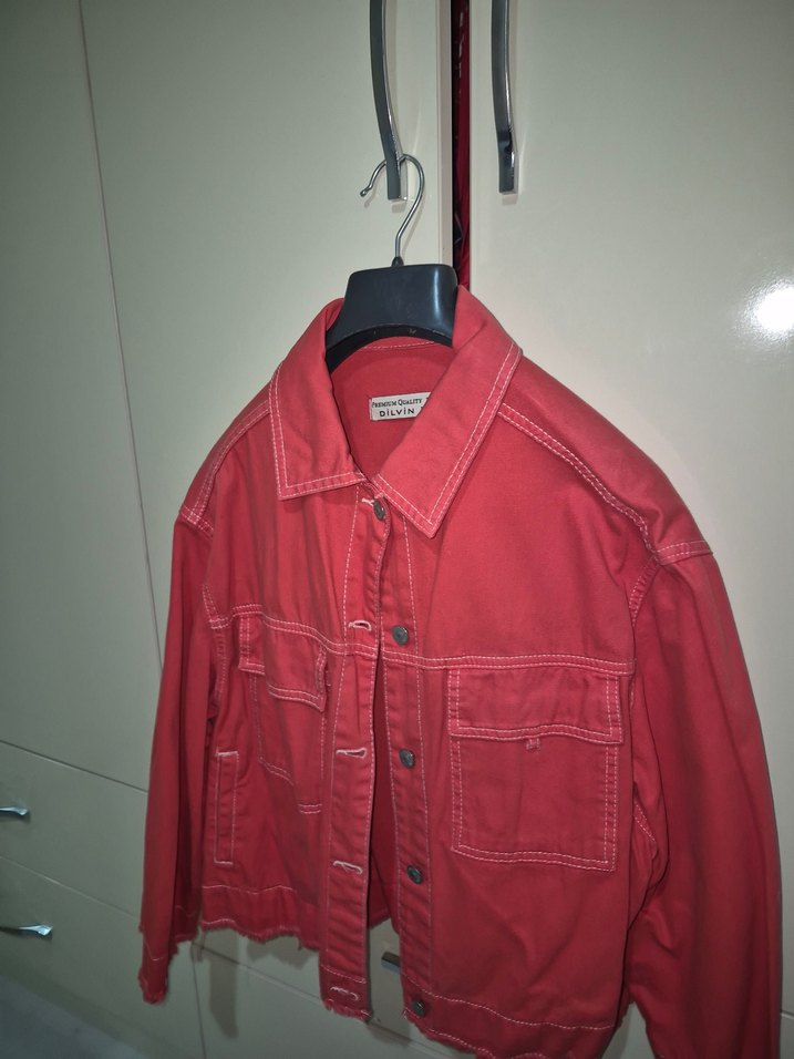 Düğmeli, uzun kollu, normal midi boyda kırmızı renkli, bol kesim kadın denim ceket. Notlu yaka tasarımıyla günlük rahat kullanıma uygun parça. Çok az kullanılmış ve oldukça iyi durumda