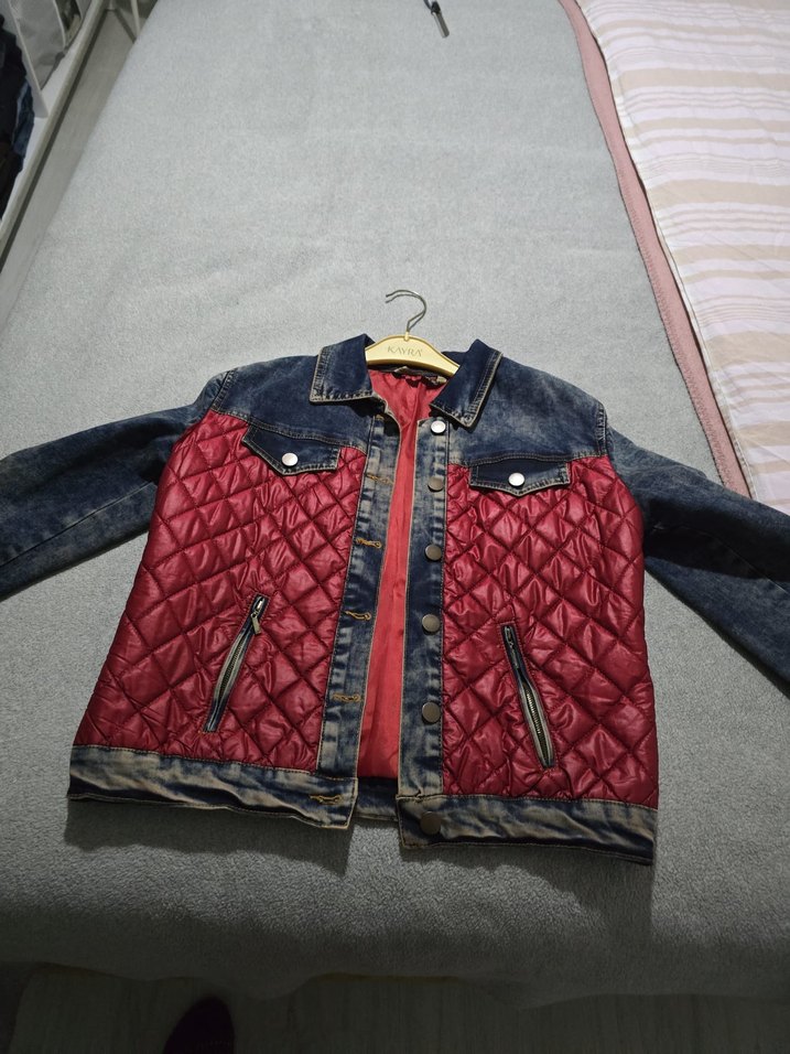 Düğmeli, uzun kollu, kırmızı kapitone ön yüzlü, fitted kesim kadın denim ceket. Günlük kullanıma uygun rahat ve şık bir parça. Cok güzel duruyor üste
