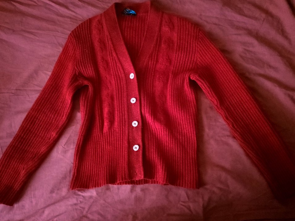 Düğmeli önü, uzun kollu ve yakalı kırmızı triko hırka. Bol kesimli ve midi boyda, günlük kullanıma uygun sade ve rahat bir model. Kumaşı hafif parlak dokudadır.