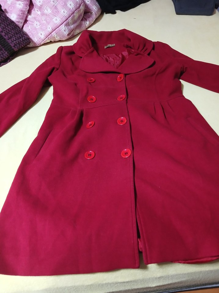 Yumuşak dokulu, klasik yakalı kırmızı kadın kaşe kaban. Uzun kollu ve düğme detaylıdır, zamansız bir stil sunar.