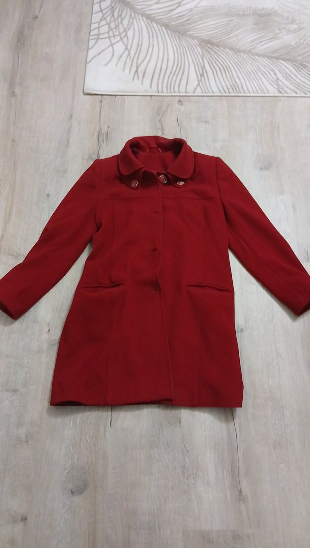 Düğmeli ön kısmı ve klasik yakası olan kırmızı kadın kaban, sıcak ve şık bir dış giyim sağlar.