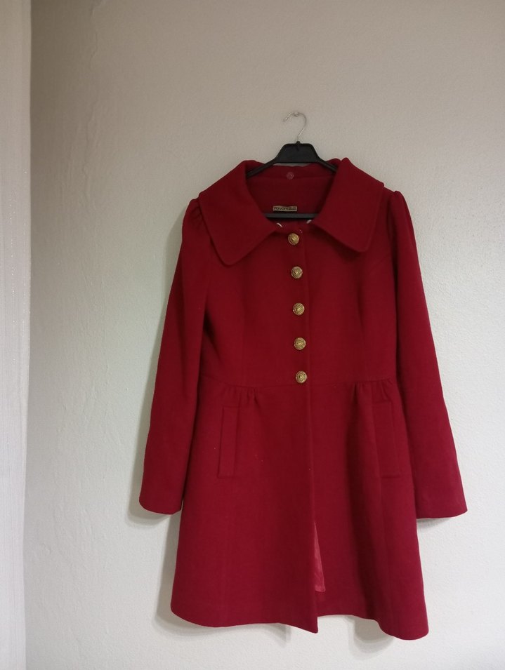 Geniş yakalı, düğmeli kırmızı kadın kaban. Uzun kollu ve iki ön cepli, sıcak tutan konforlu kumaştan üretilmiştir.