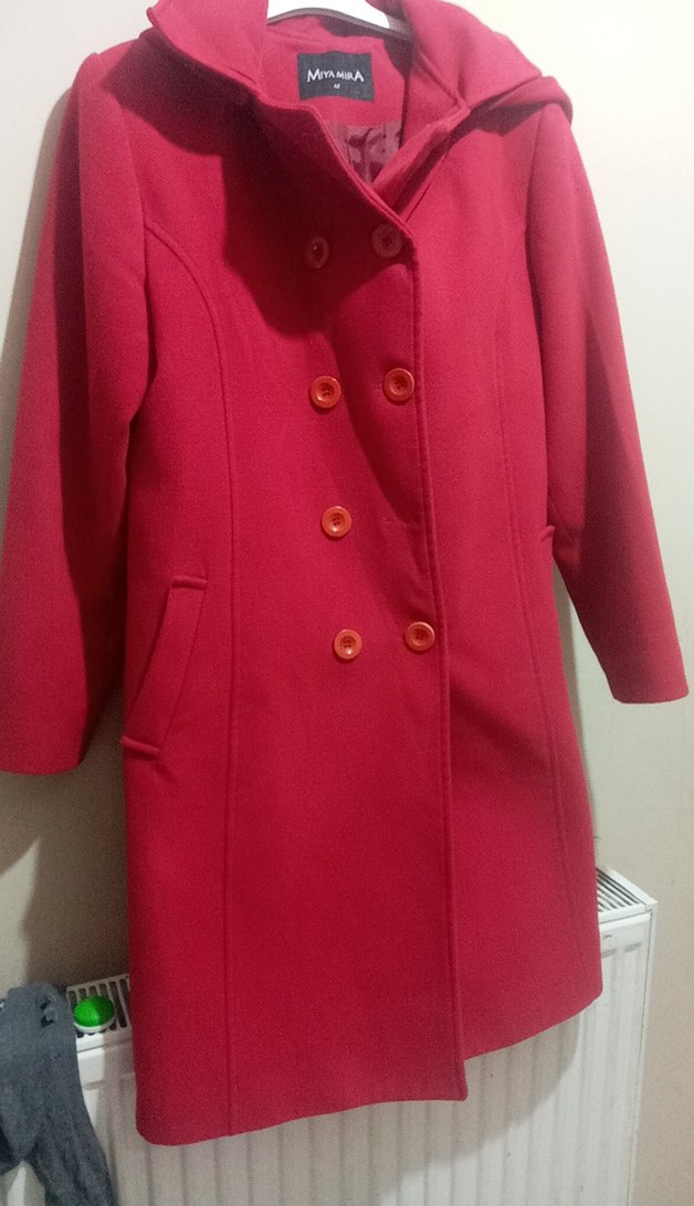 Çift sıra düğmeli, yan cepli kırmızı kadın kaban, klasik ve sıcak bir dış giyim seçeneği sunar. yeni gibi sadece bir düğmesi eksik