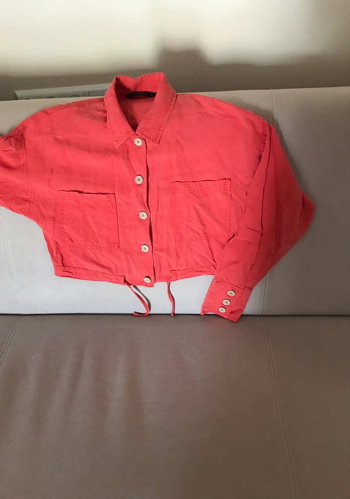 Düğmeli, yakalı, kırmızı keten ceket.Salaş kesim, uzun kollu ve pamuklu kumaş günlük rahat kullanıma uygundur.
