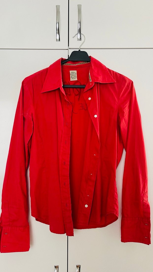 Düğmeli ön kısmı, uzun kollu ve yakalı kırmızı keten gömlek. Normal kesim ve parlak dokusuyla ofis için uygundur.