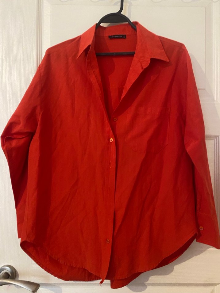 Düğmeli kırmızı keten kadın gömlek, notlu yaka ve uzun kolludur. Rahat kesimi ve midi boyu ile ofis için uygundur. Minimalist tarzda parlak dokusu vardır. ✨