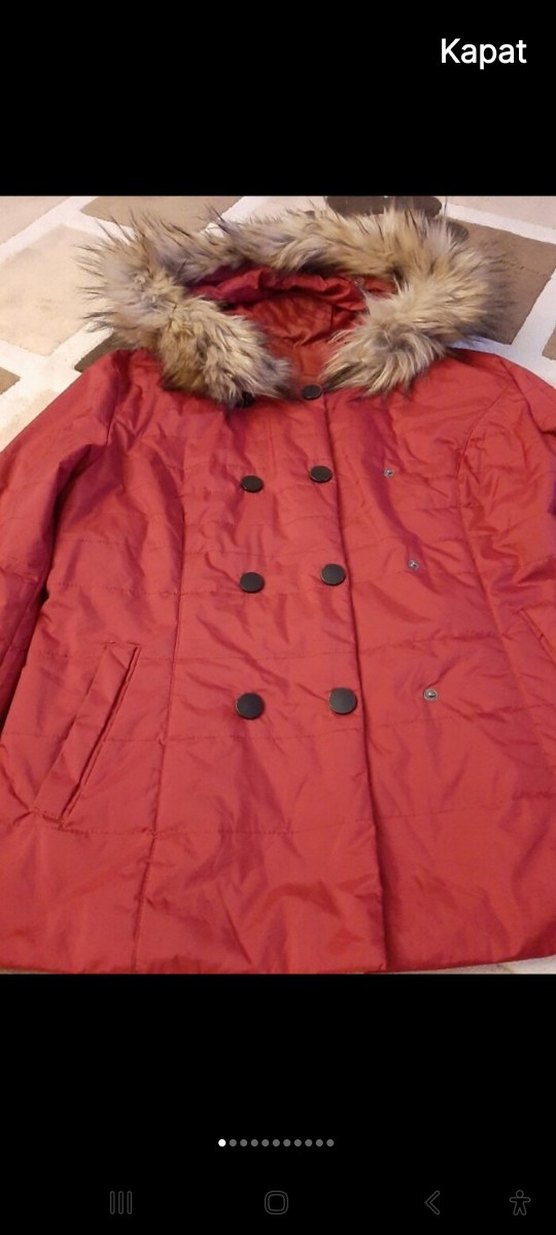 Düğmeli, kırmızı kadın kışlık mont, sentetik kumaş ve kürklü kapüşon ile midi boyda, uzun kollu ve trend sokak stiline uygun rahat kesim.