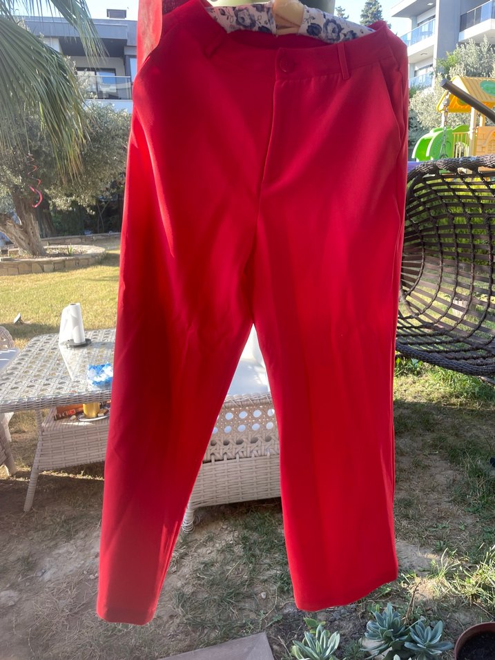 Düğmeli, kırmızı kadın kumaş pantolon. Normal boy ve parlak dokuda, sokak stili ve iş kombinlerine uygun.