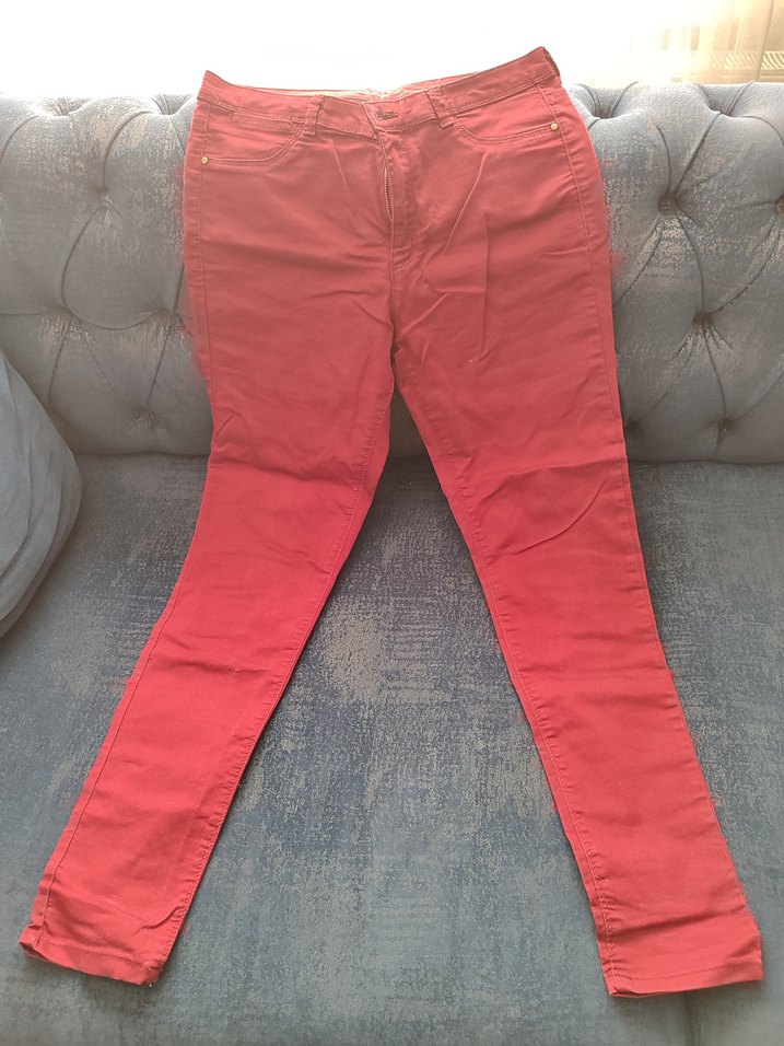 Düğmeli ön kısmı ve midi boyu ile kırmızı, dar kesim kadın pantolonu. Pürüzsüz sentetik kumaştan günlük kullanım için uygundur.