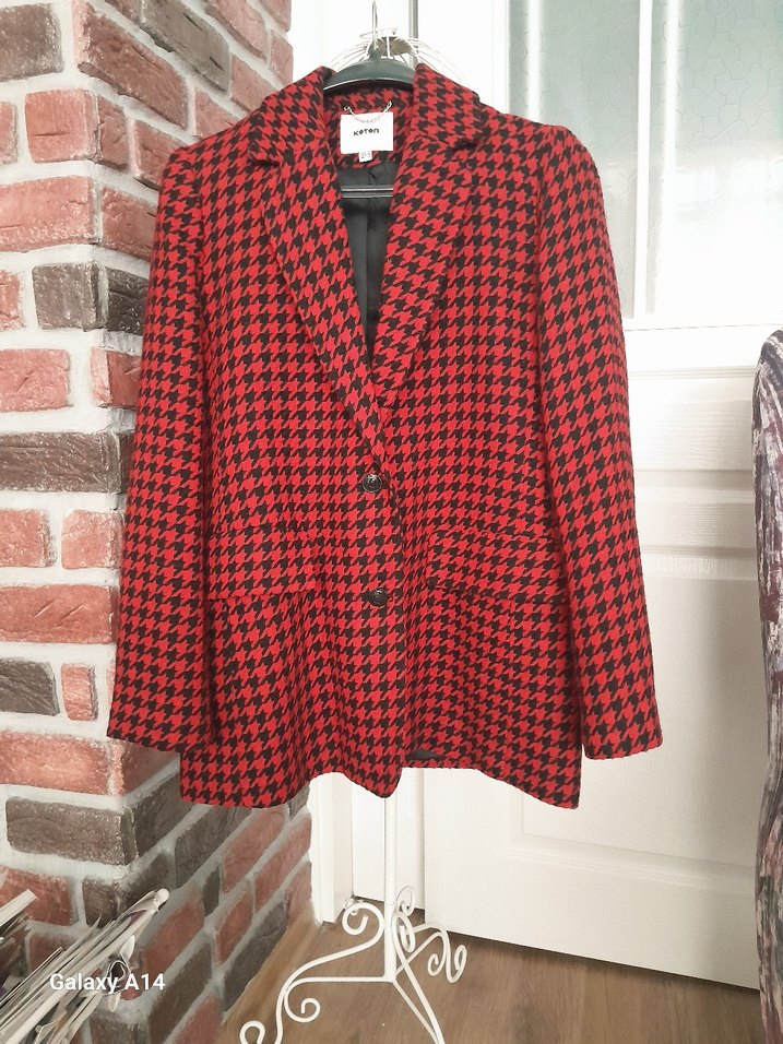 Kadınlar için düğmeli, normal kesim ve midi uzunlukta kırmızı blazer.Ekose kumaştan, uzun kollu ve ofis ve sokak kullanımı için uygun. Notched yaka ve desenli dokusu ile dikkat çekiyor.