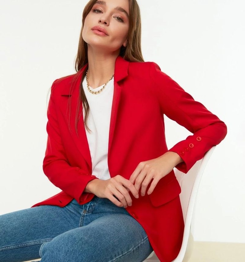 Düğmeli uzun kollu, kırmızı midi blazer ceket. 34 beden trendyolmilla sadece bir kez giyildi etiketi üstünde