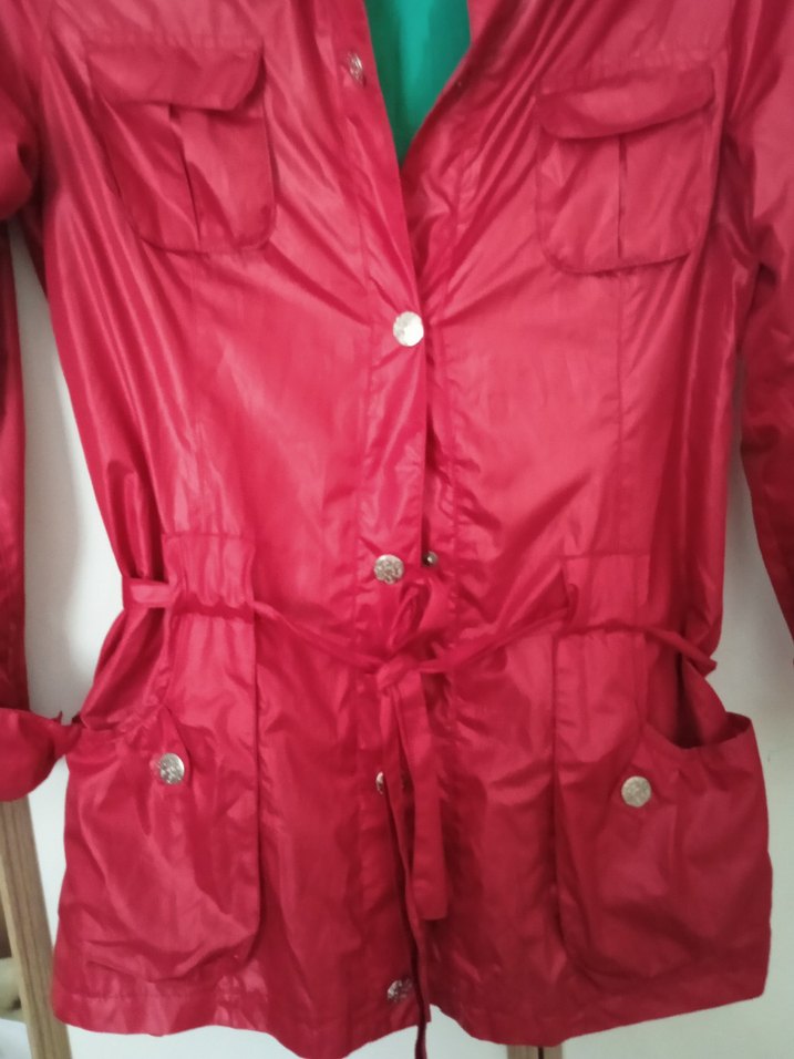 Fotodaki kadar kırmızı değildir biraz koyu renkte , düğmeli ve normal boy midi kadın ceketi, notched yakalı ve kemer detaylıdır. Dış mekanlar için uygundur.