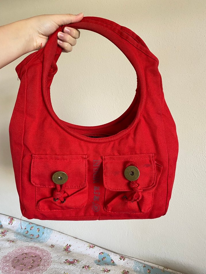 Düğmeli ön cepleri ve parlak kırmızı rengiyle kadın omuz çantası. Yumuşak ve sıcak kumaştan, minimalist ve trend günlük sokak stiline uygun.