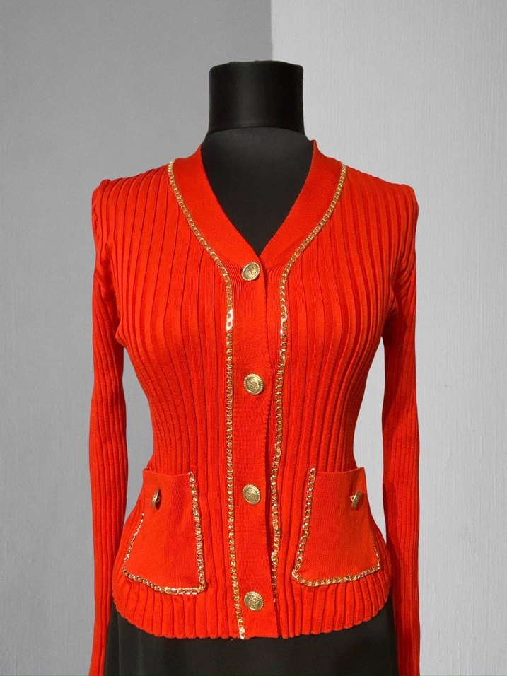 Düğmeli, kırmızı triko hırka, uzun kollu, v yaka ve işlemeli detaylıdır. Ön cepleri altın işlemeli, midi boyda, günlük kullanıma uygundur.