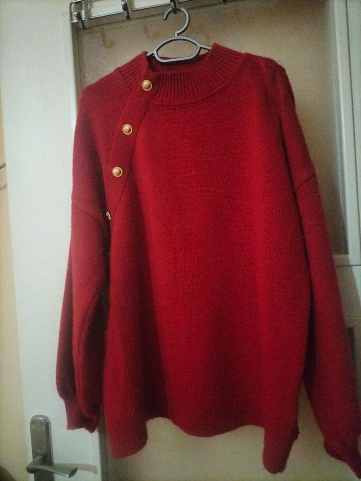 Parlak kırmızı renkte, düğmeli, yuvarlak yaka ve uzun kollu, bol kesim kadın triko kazak. Normal midi boyda, rahat ve sıcak tutar. temizdir hiç bir sorunu yoktur orijinal pierre cardin markalı