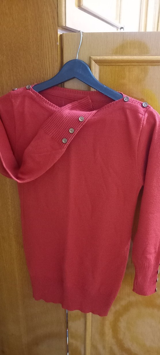 Düğmeli, uzun kollu, yuvarlak yaka kırmızı triko kazak. Rahat kesimli, omuz ve sırt kısmında düğme detayları bulunur.