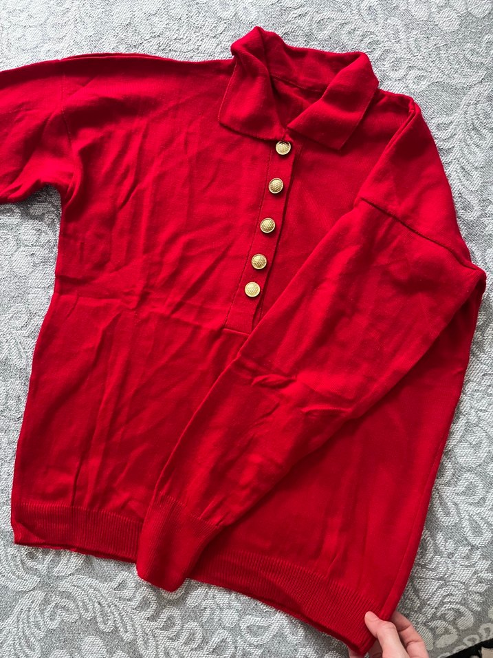 Düğmeli, yakalı ve parlak kırmızı renkte, uzun kollu, bol kesim kadın kazak. Yumuşak ve sıcak kumaştan, midi boyda, rahat sokak tarzı için uygun. Sadece omzumda aksesuar olarak kullandım . Marka temsilidir
