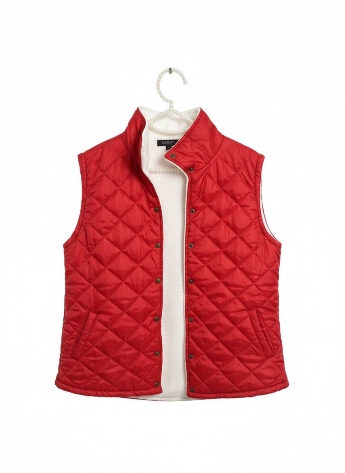 Düğmeli, yüksek yakalı kırmızı kadın yelek, kapitone desenli ve yumuşak, sıcak dokulu kumaştan üretilmiştir dar kalıptır. Günlük ve sokak stiline uygundur.