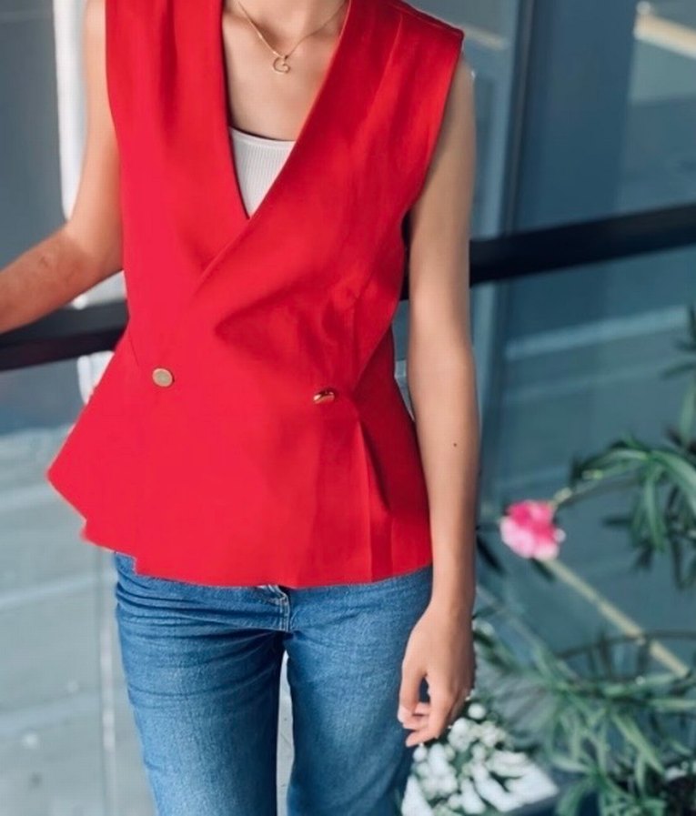 Düğmeli kırmızı renkli kadın yelek, normal boy midi kesim ve kolsuz tasarıma sahiptir. Suni kumaştan üretilmiş, günlük sokak tarzı için uygundur.