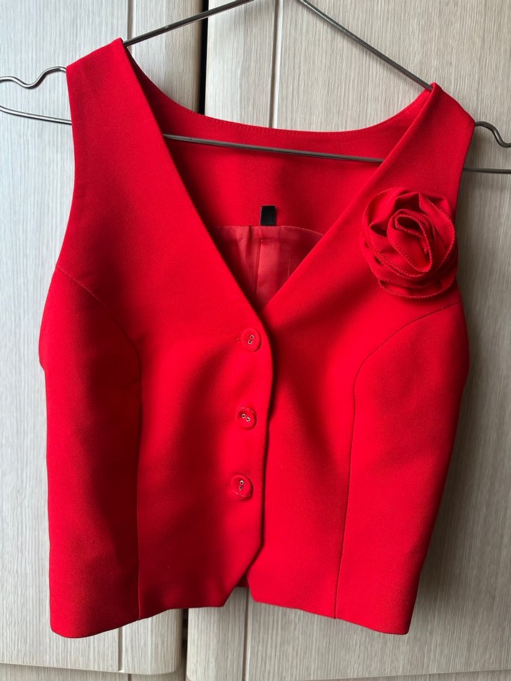 Düğmeli ve çiçek detaylı, kırmızı, v yaka, kolsuz kadın yelek. Sentetik kumaştan, modern klasik tarzda, günlük kullanıma uygun.