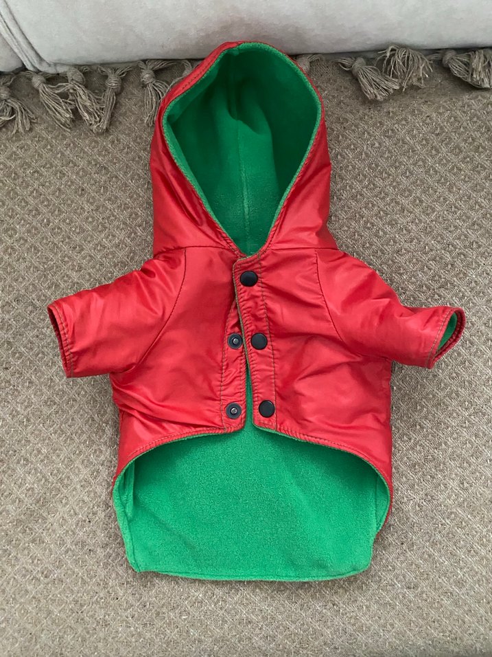 Düğmeli kırmızı kapüşonlu köpek montu, yumuşak yeşil iç astarlı, renkli ve sokak tarzı görünüme sahip.içi polar,1-4 kılo kopekler için uygun