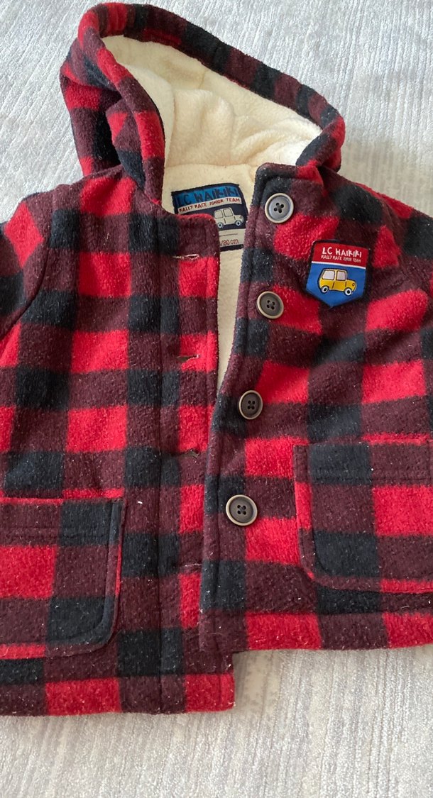Düğmeli ön kapama ve kesik yaka detaylı, kırmızı-siyah kareli, yumuşak ve sıcak kumaştan yapılmış erkek çocuk kabanı. Ön cepleri ve küçük rozet detayı bulunur.