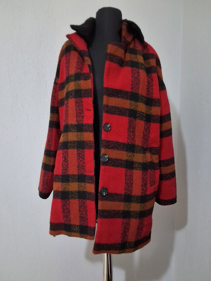 Düğmeli, notched lapel detaylı, kırmızı kareli yumuşak dokulu hamile kabanı. Salaş kesim ve midi boy, günlük kullanıma uygun uzun kollu model.