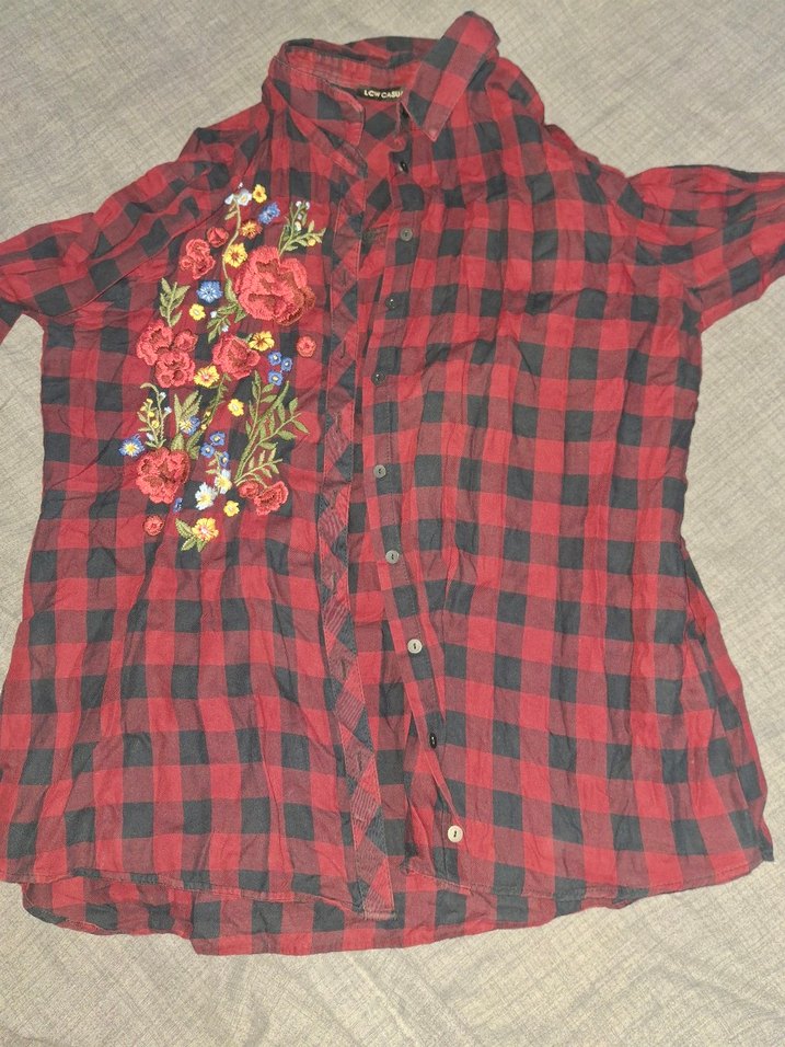 Düğmeli, uzun kollu , yakalı ve dar kesim kadın gömlek. Koyu kırmızı kareli tekstil üzerine nakışlı çiçek detaylarına sahiptir, günlük kullanıma uygundur.