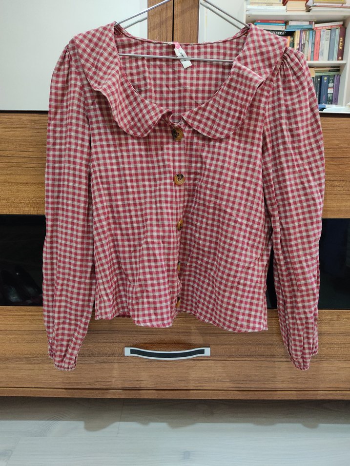 Düğmeli, uzun kollu, yakalı ve bol kesim kırmızı kareli pamuklu gömlek. Rahat ve günlük stil için uygundur.