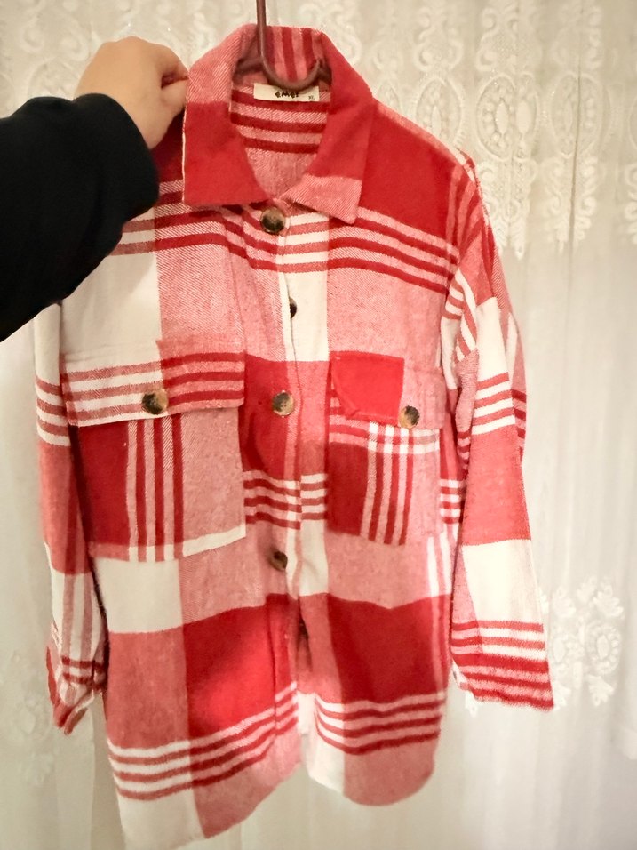 Yumuşak pamuktan, açık kırmızı kareli desenli, düğmeli uzun kollu, salaş kesim kadın gömlek. Notlu yaka ve cepli, günlük rahat sokak stili için uygun.