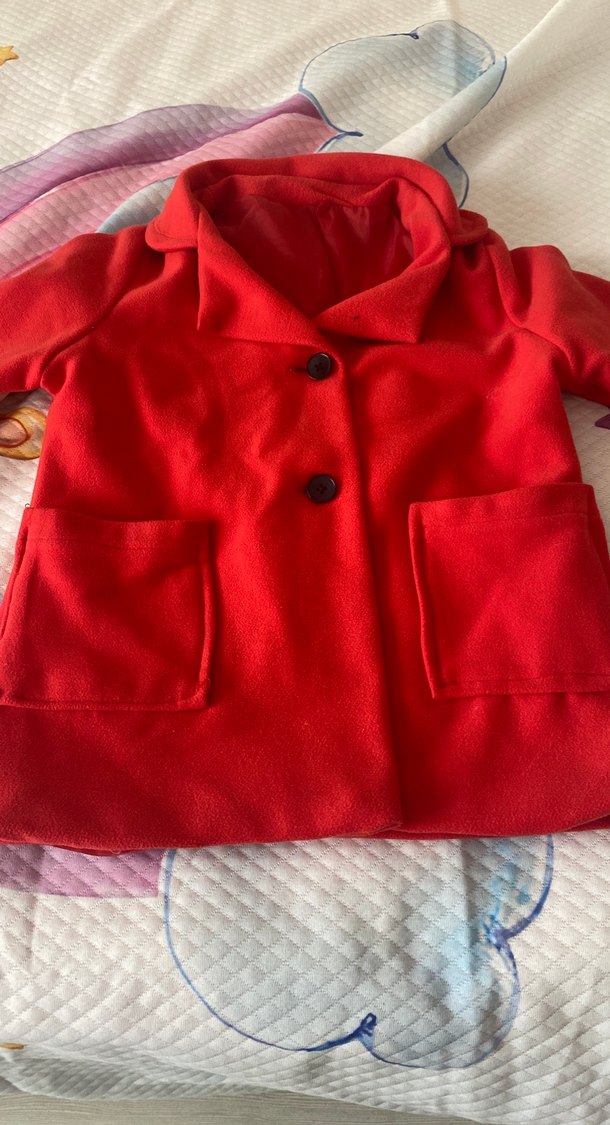 Parlak kırmızı renkte, düğmeli ve yakalı kaşe mont annanemiz dikmisti hazır giyim değildir