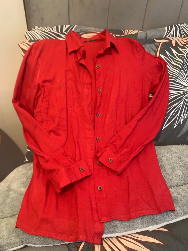 Kırmızı keten gömlek, düğmeli ön, uzun kollu ..fit kesimi , desensiz kumaşıyla rahat günlük stil için uygundur.Basende biter uzun değil