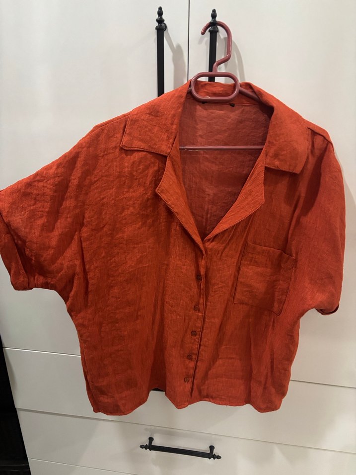 Kırmızı keten kumaştan, düğmeli, kısa kollu ve yakalı, bol kesim kadın gömleği. Parlak ve desensiz yapısıyla günlük kullanıma uygun.