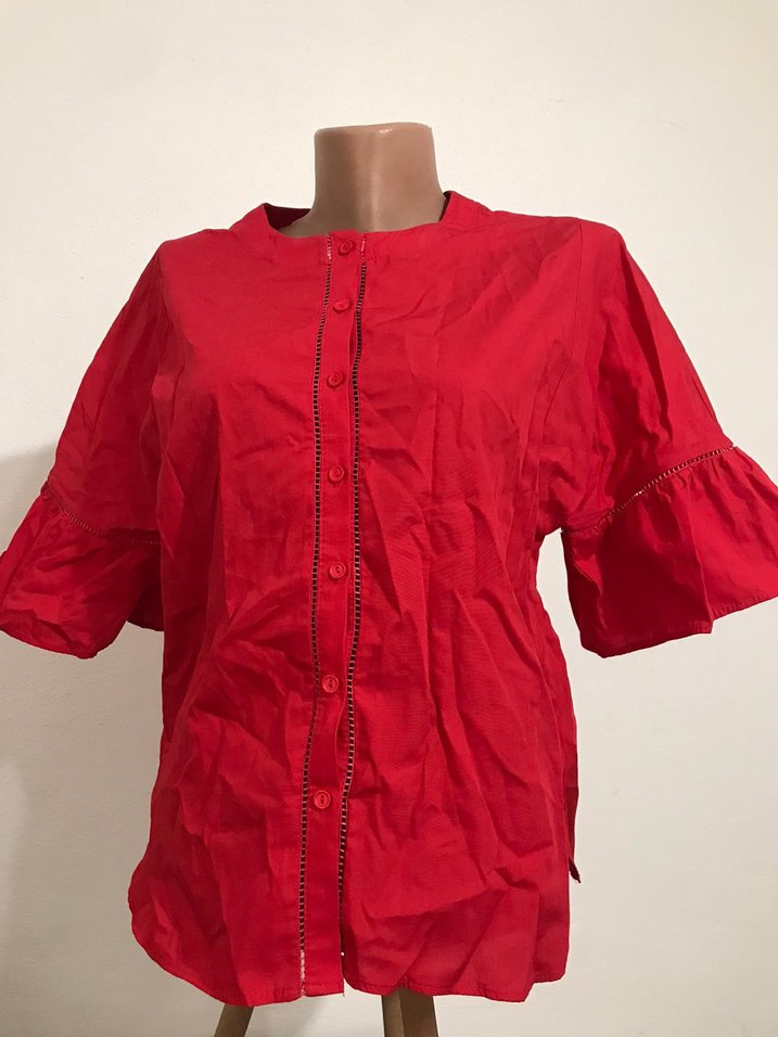 Parlak kırmızı keten, düğmeli ön kısmı, kısa kollu, yuvarlak yakalı, bol kesim mini kadın gömleği. Günlük kullanım için bohem tarzda.