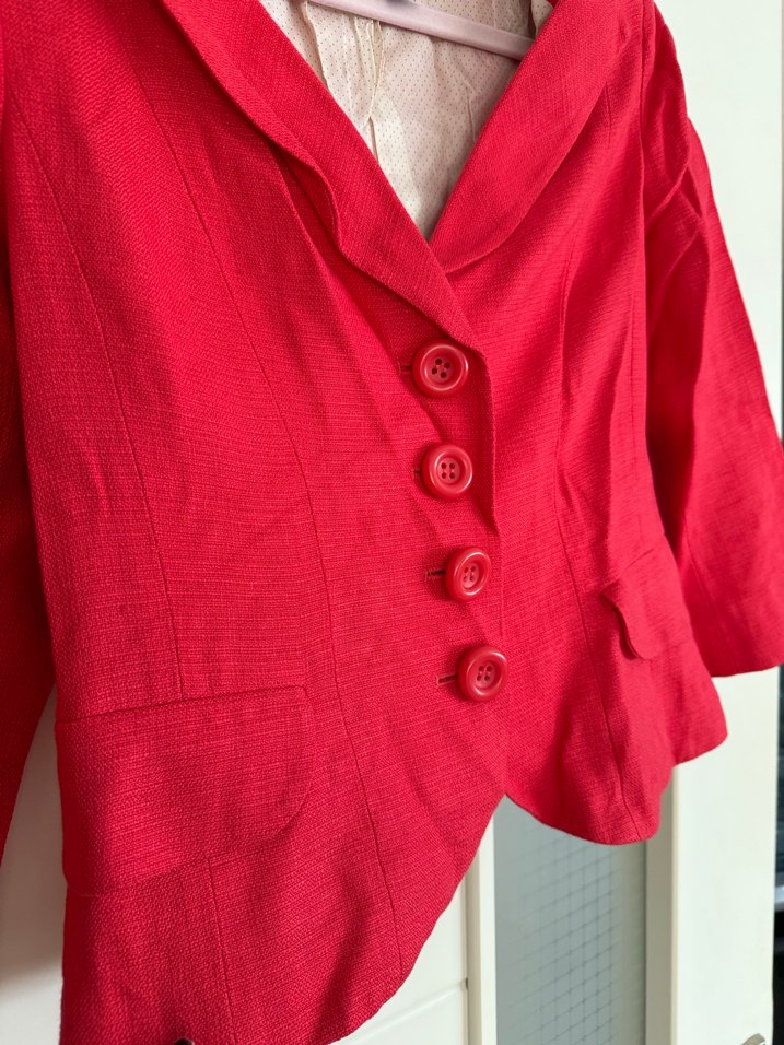 Düğmeli, parlak kırmızı keten kumaştan, kısa kollu, normal midi uzunlukta, vintage ve avangart tarzda, ofis için uygun dar kesim kadın ceket.