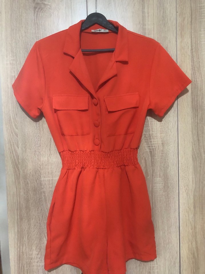Düğmeli, kısa kollu kırmızı tulum, bel kısmı lastikli ve dar kesimdir. Günlük kullanıma uygun, sentetik kumaştan üretilmiştir.
